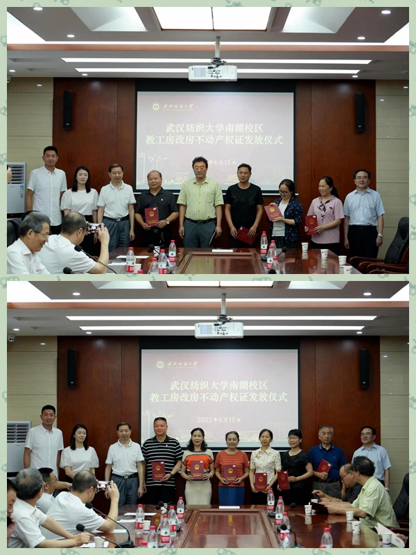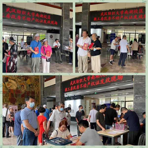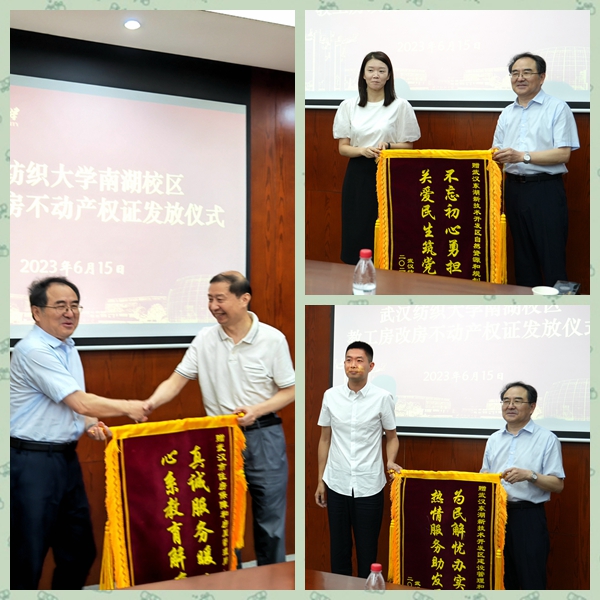 仪式上,学校领导向武汉市住房保障和房屋管理局、武汉东湖新技术开发区自然资源和规划局、武汉东湖新技术开发区建设管理和交通局赠送锦旗,学校领导、市区局领导为业主代表发放了不动产证书。